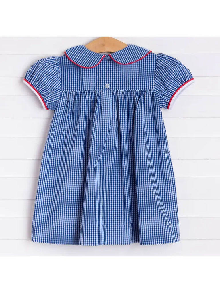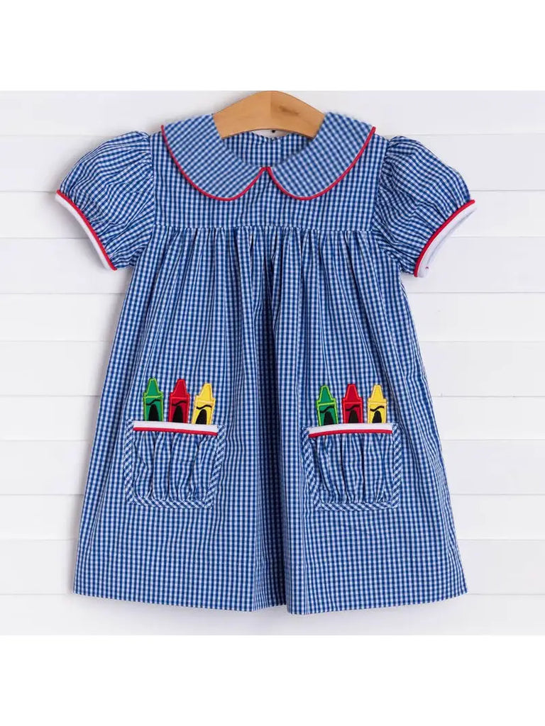 School is back in session! A precious blue gingham Peter Pan collar trimmer in red pipping, along with colorful crayons peaking out of the two front pockets in bright colors.  This dress will inspire any little girl to create and play.  Add your child's name to the left collar in red. This dress is true to size. 100% woven cotton blue gingham fabric with crayon embroideries on 2 sides. Hand wash cold. Do not bleach. Lay flat to dry.