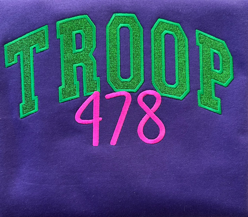 - Custom-made Girl Scout sweatshirts personalized with your troop number. Each design is crafted using a combination of embroidery, HTV, and embroidered appliqué for a high-quality finish. Gildan 50/50 blend.